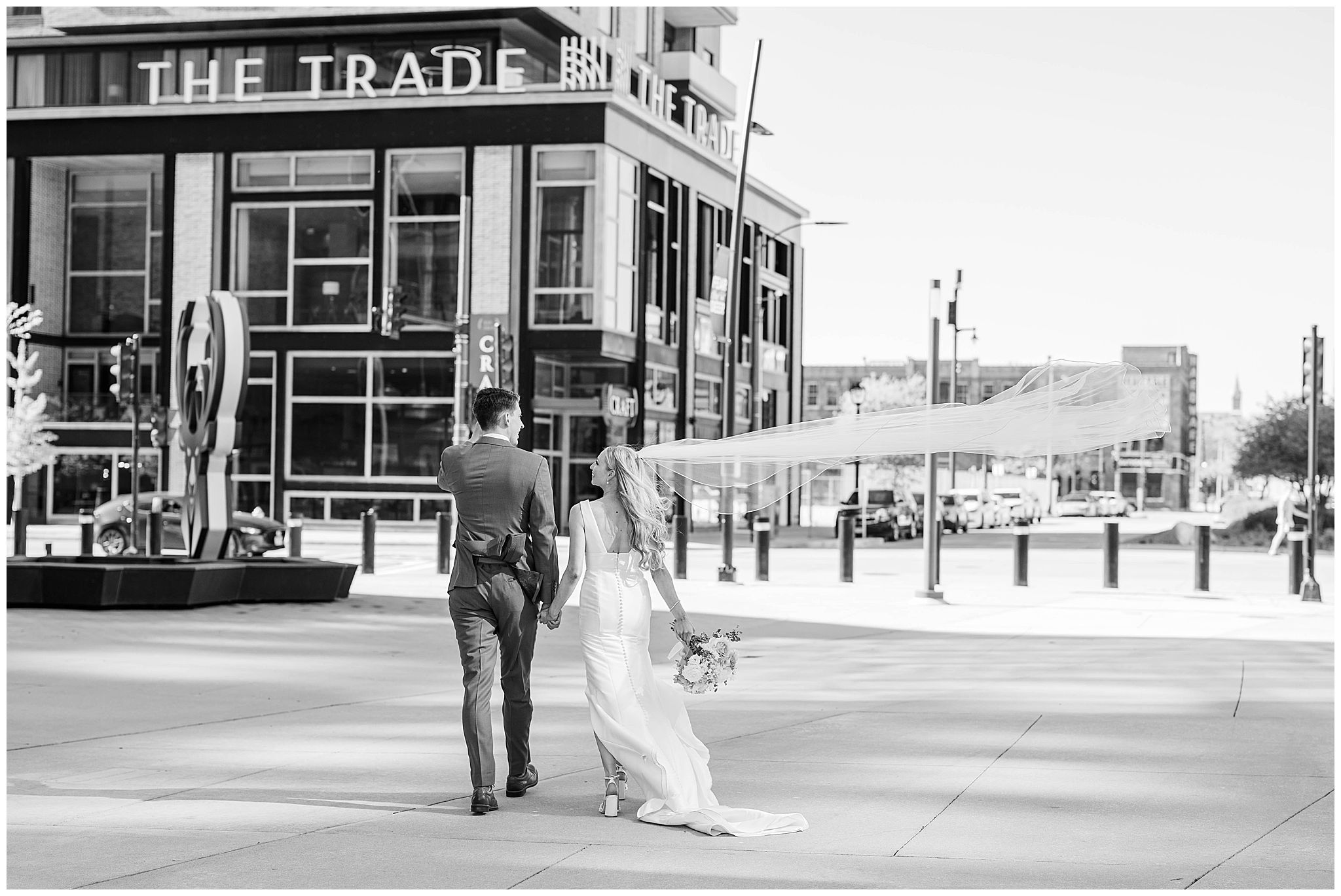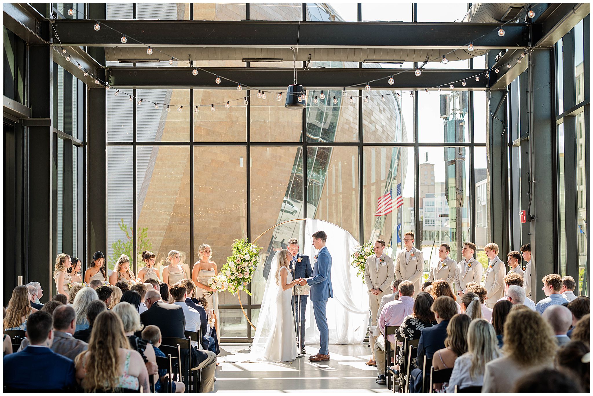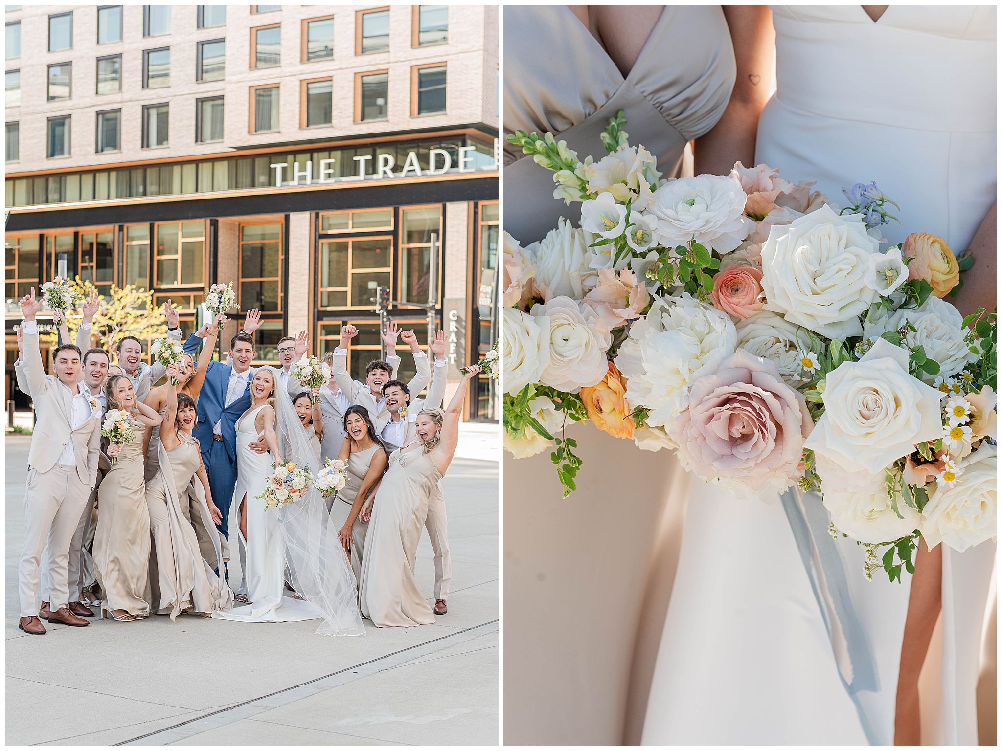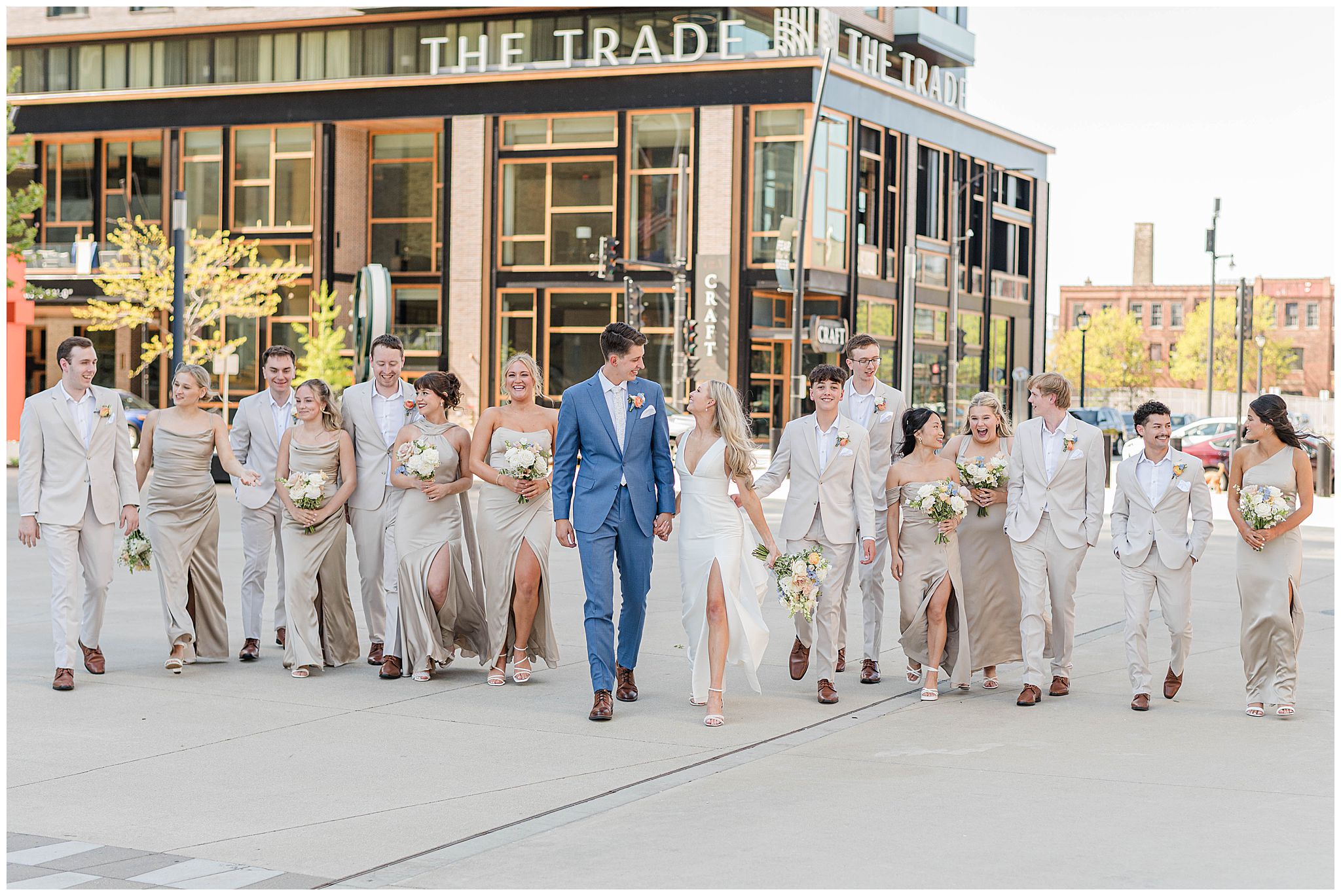 The day began just steps away from the venue at The Trade Hotel, located directly across the street from Gather at Deer District. I’ve had many couples get ready there and it makes that day so seamless with such little travel time. The hotel itself is incredibly classy, with unique design elements and a high-end feel, offering multiple beautiful spaces that are perfect for getting ready. Natural light, modern textures, and an upscale atmosphere set the tone for the day, and being able to simply walk across the street to the venue was such a luxury â especially in the middle of a vibrant Milwaukee wedding day.
