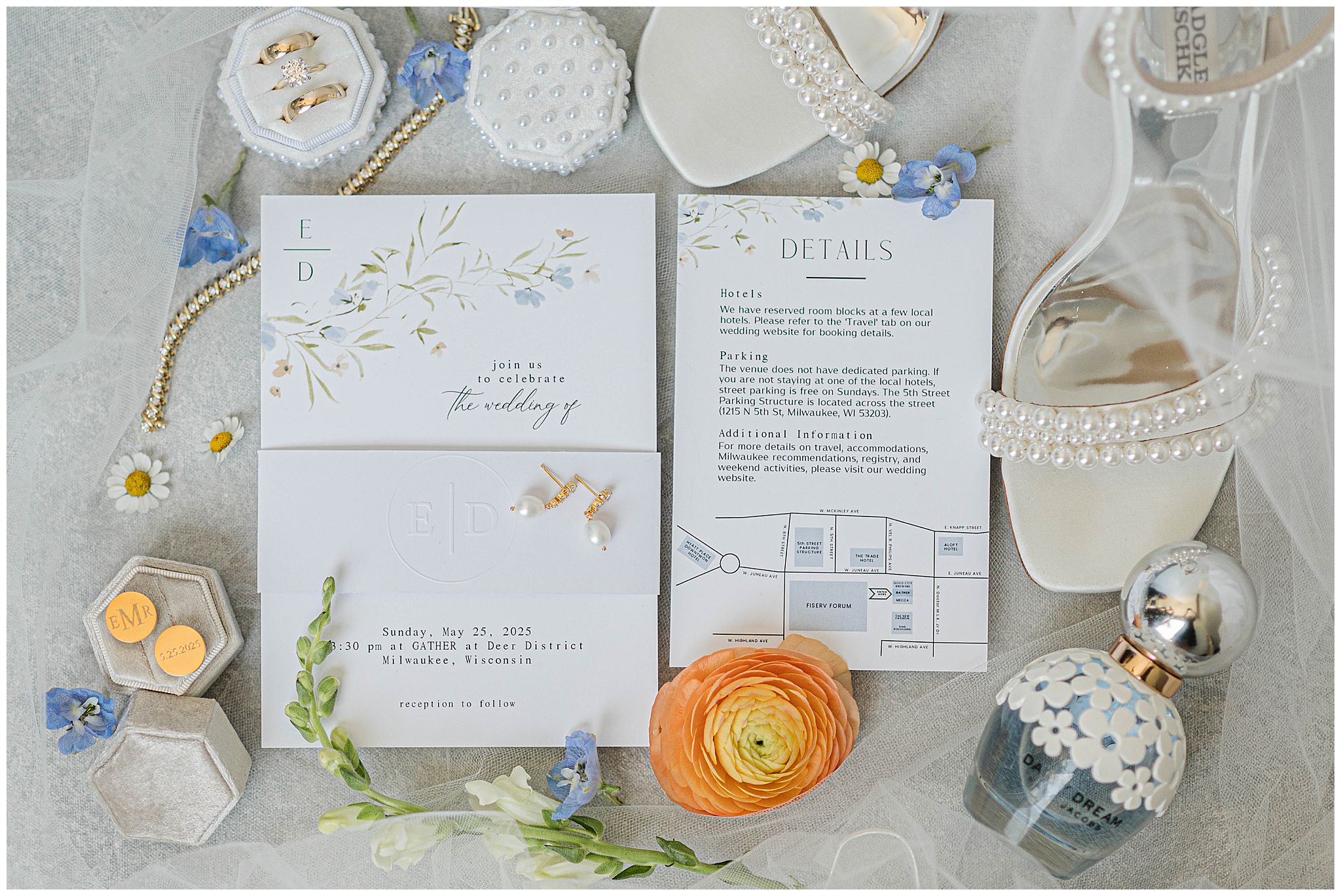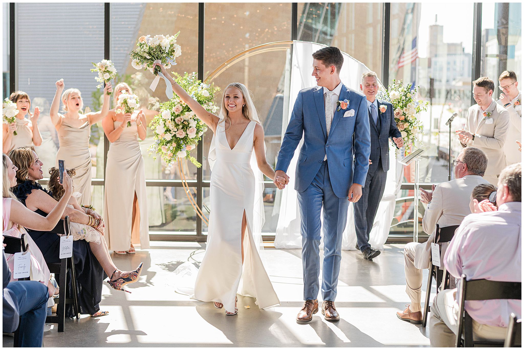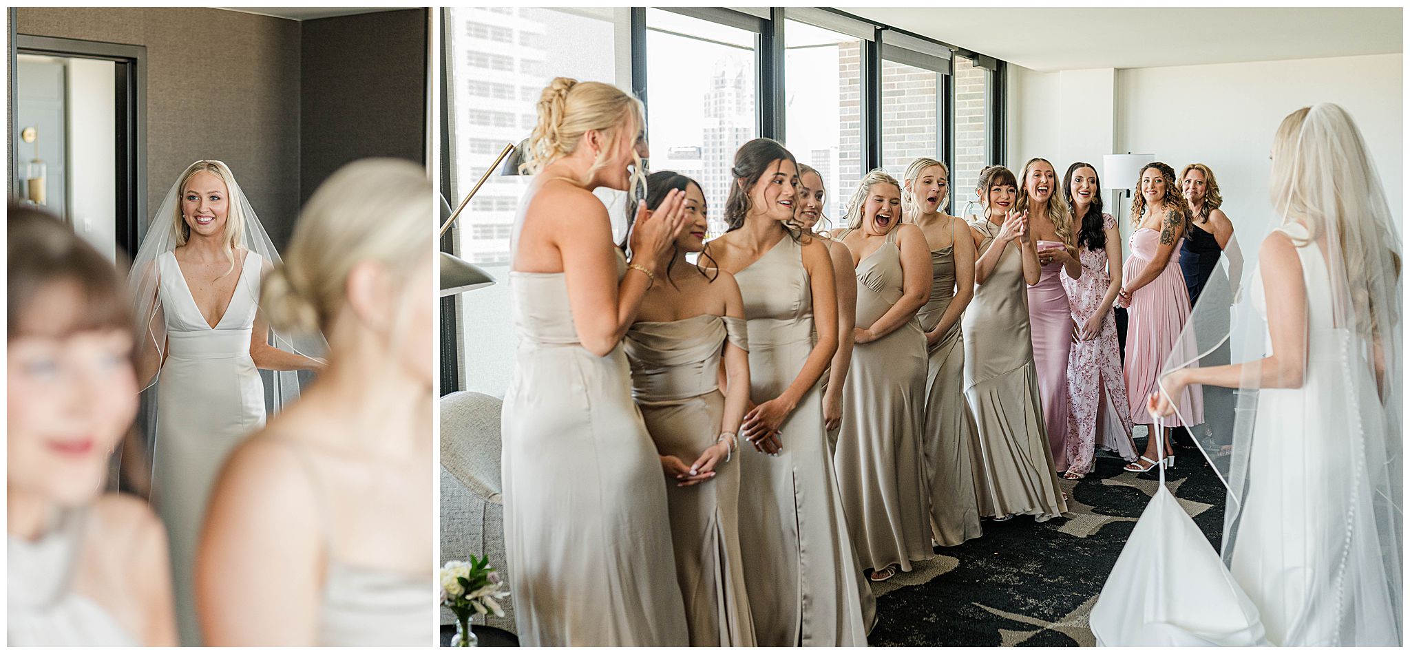 The day began just steps away from the venue at The Trade Hotel, located directly across the street from Gather at Deer District. I’ve had many couples get ready there and it makes that day so seamless with such little travel time. The hotel itself is incredibly classy, with unique design elements and a high-end feel, offering multiple beautiful spaces that are perfect for getting ready. Natural light, modern textures, and an upscale atmosphere set the tone for the day, and being able to simply walk across the street to the venue was such a luxury â especially in the middle of a vibrant Milwaukee wedding day.