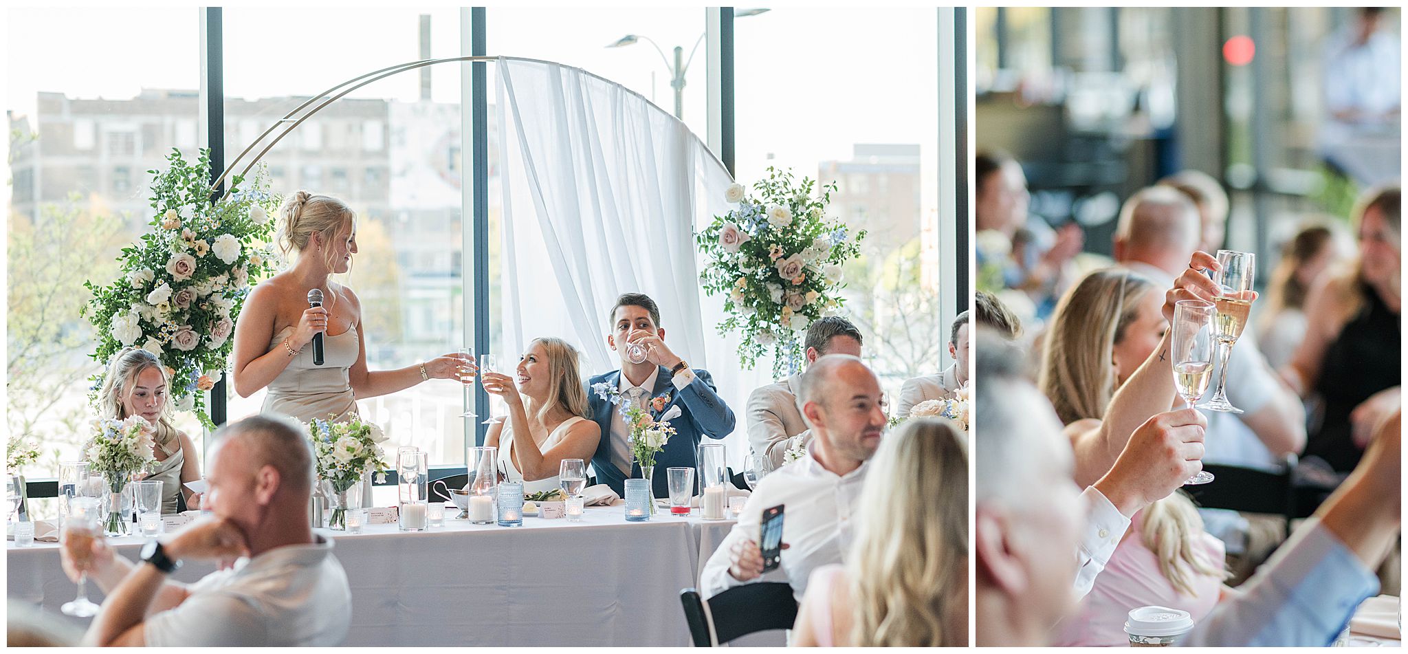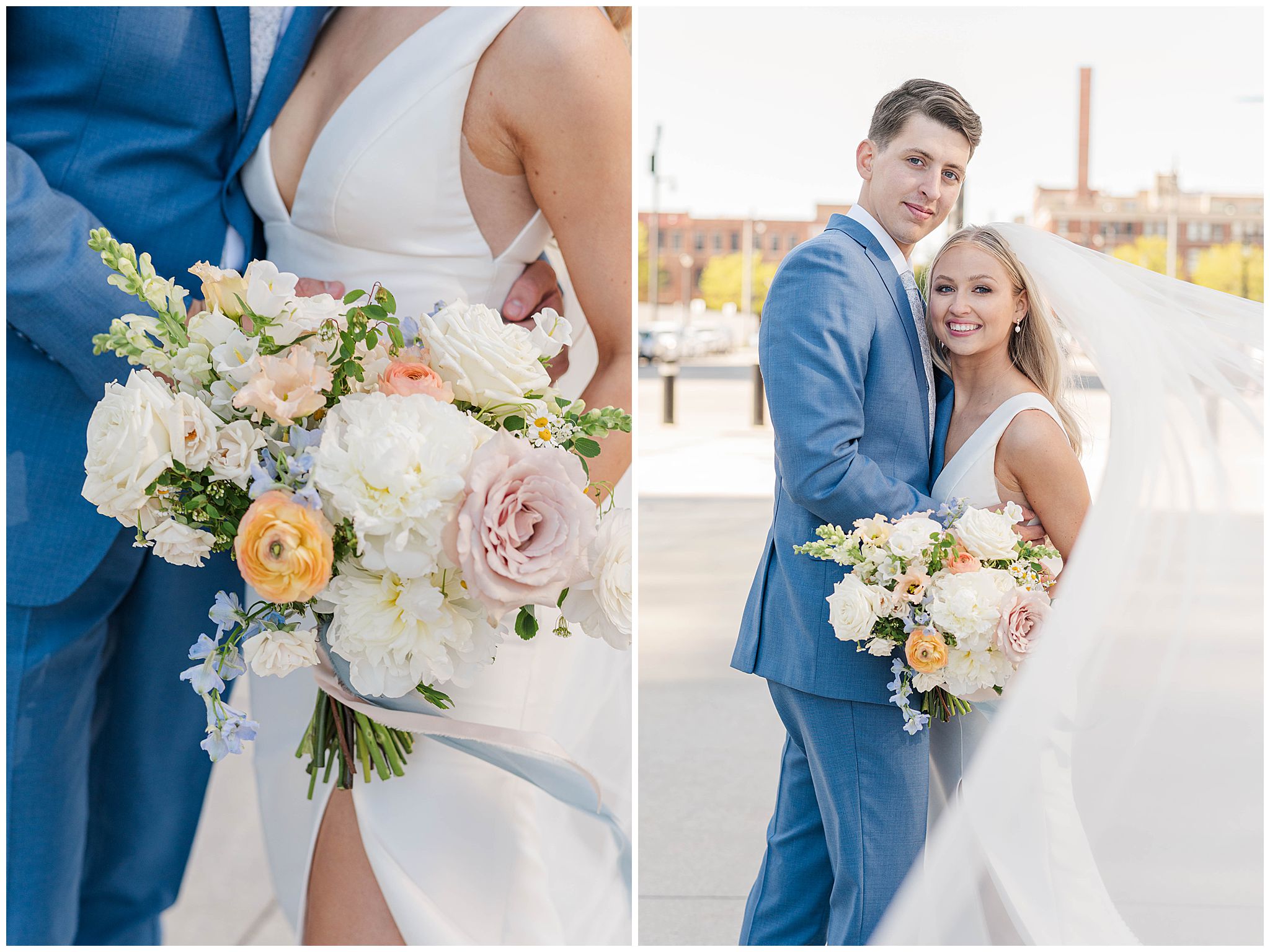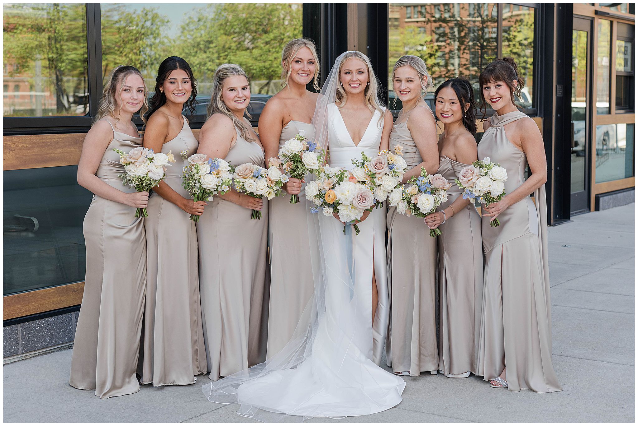 As guests arrived in the Deer District, the energy of the city surrounded them â spring sunshine, buzzing streets, and the excitement of celebrating a couple so clearly adored by their friends and family. Gather at Deer District provided the perfect backdrop for Elora and Dayneâs vision. The modern, bright open space came alive with soft spring colors, thoughtful design choices, and a wedding party whose style perfectly complemented the aesthetic. Neutral tones mixed with subtle pops of color, fresh florals, and timeless details created a look that felt polished, joyful, and inviting!