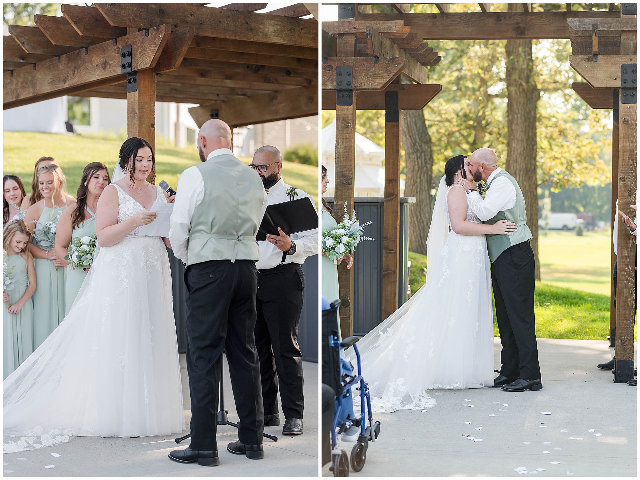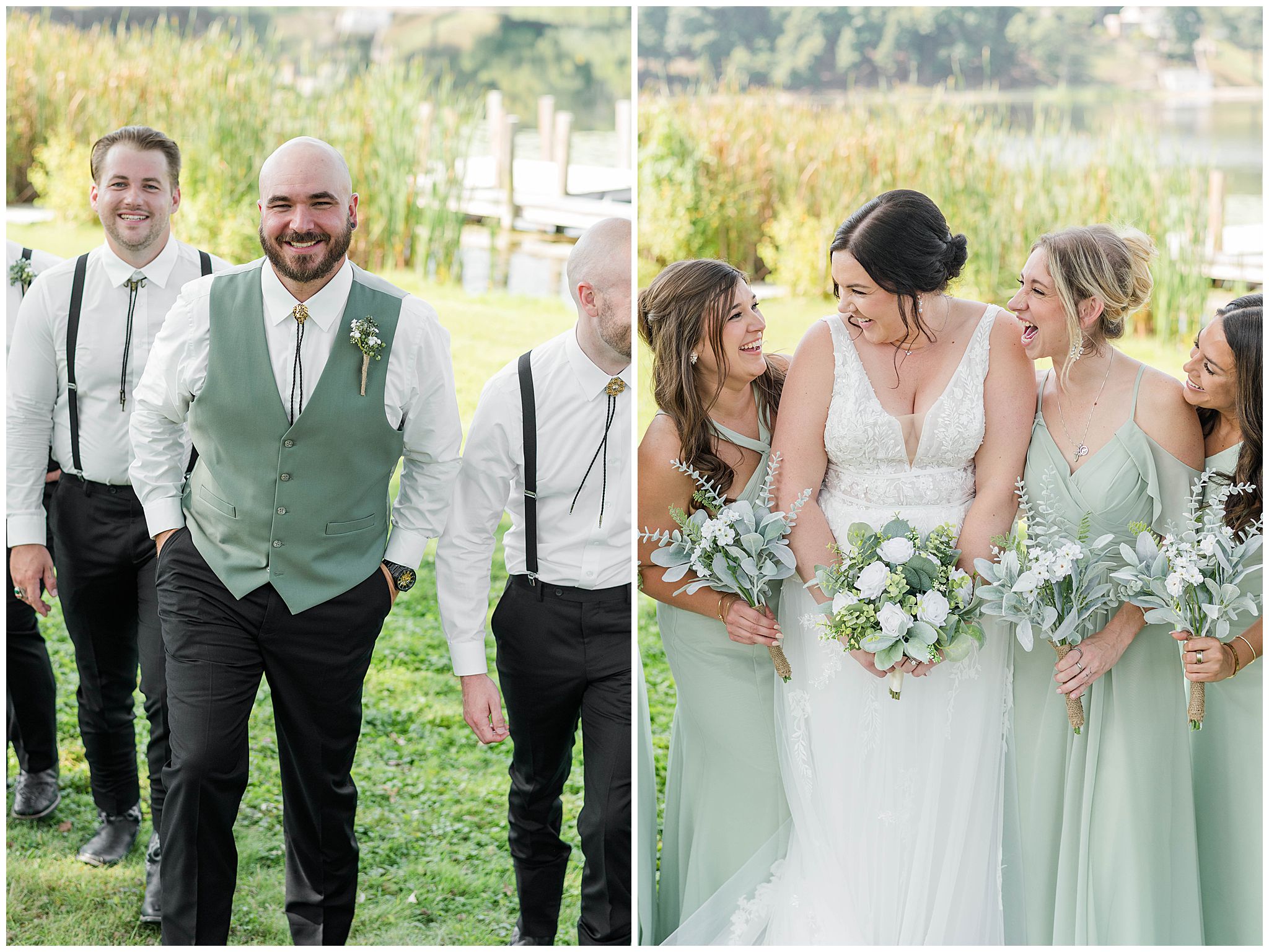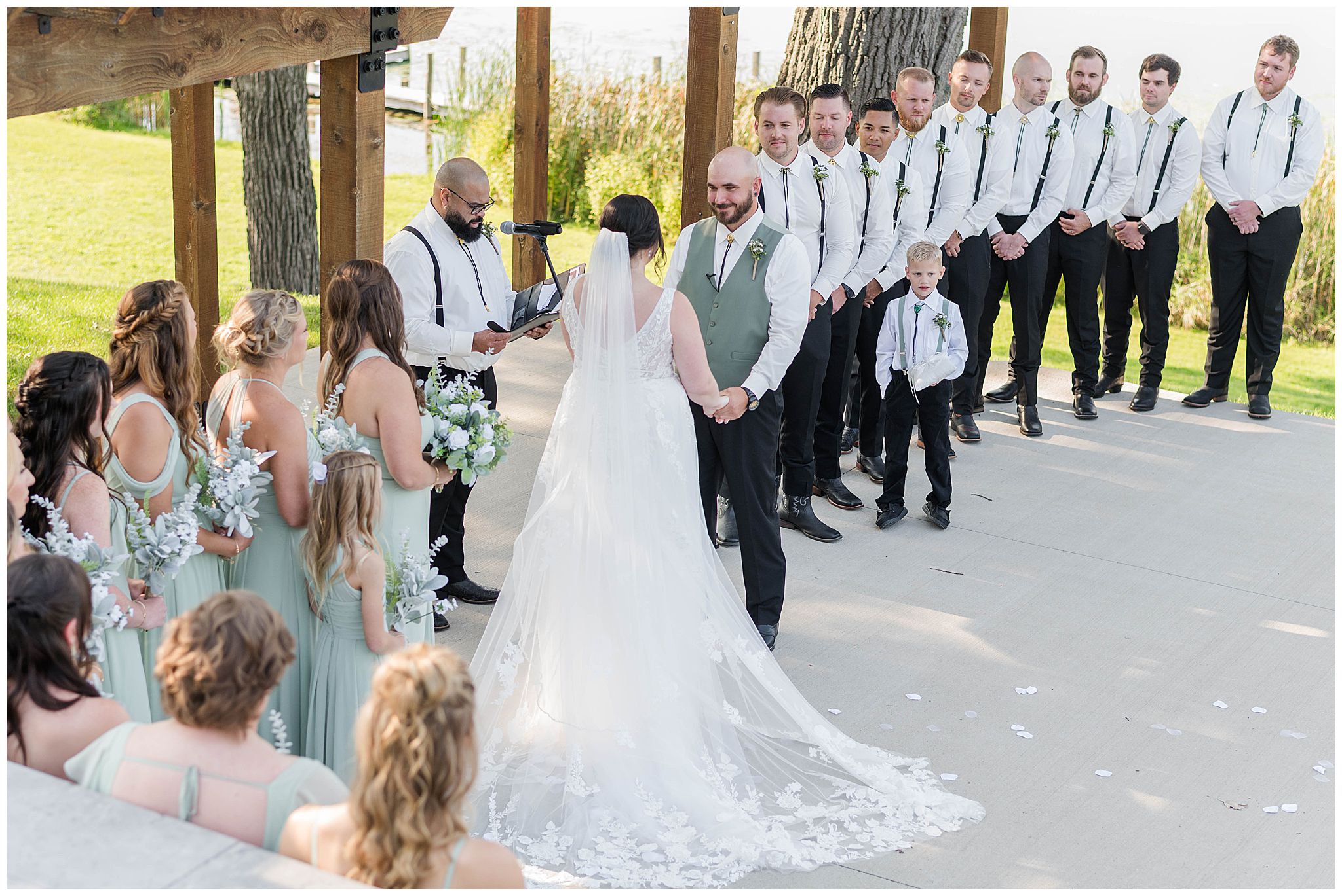 Liz and Devin’s ceremony took place at the beautiful outdoor ceremony space at Nippersink on the Lake, right by the water. With the bright September sunshine reflecting off the lake and their closest friends and family gathered around them, it created such a romantic setting.