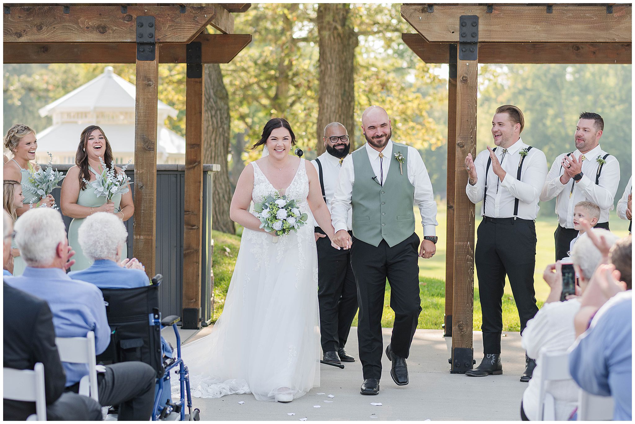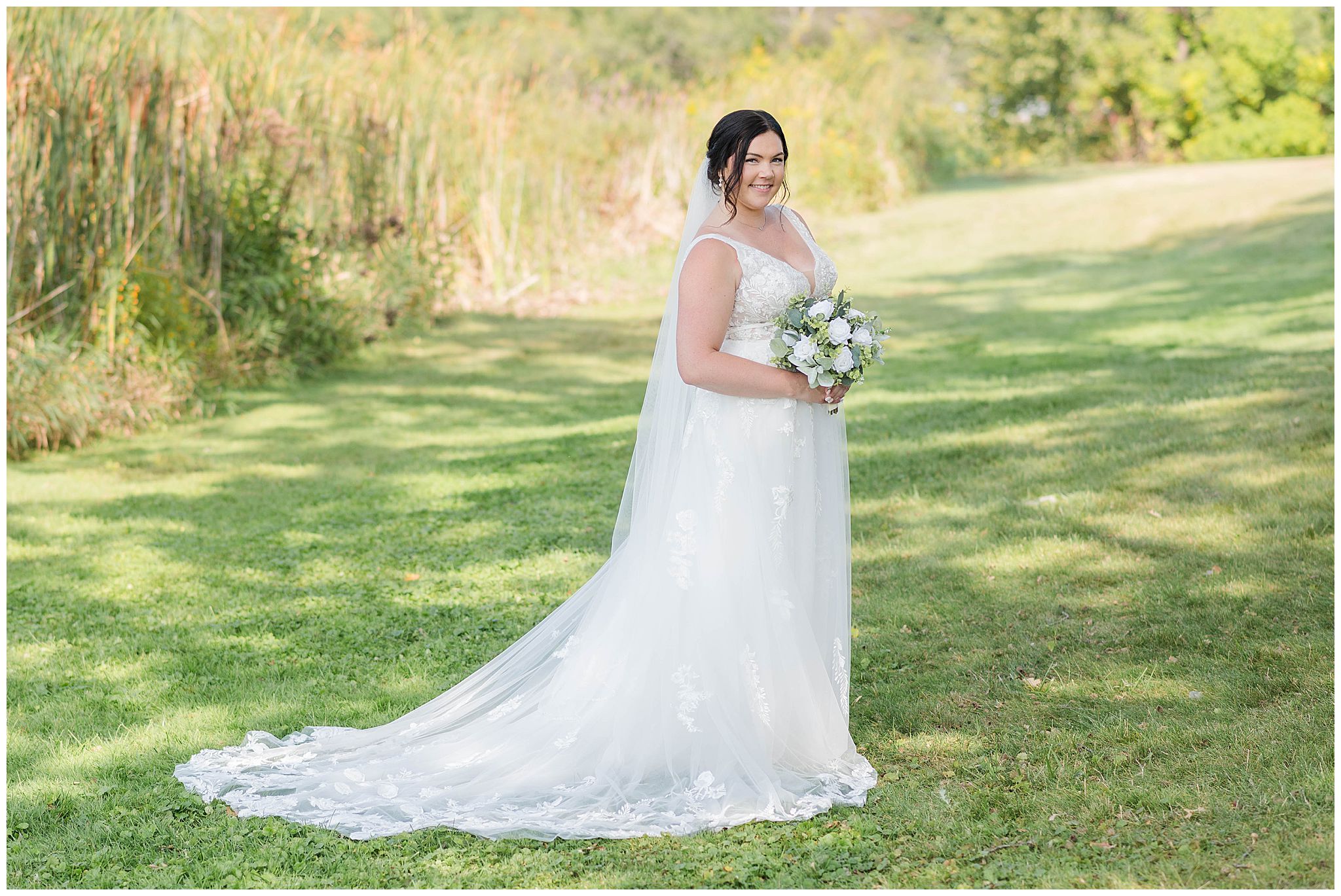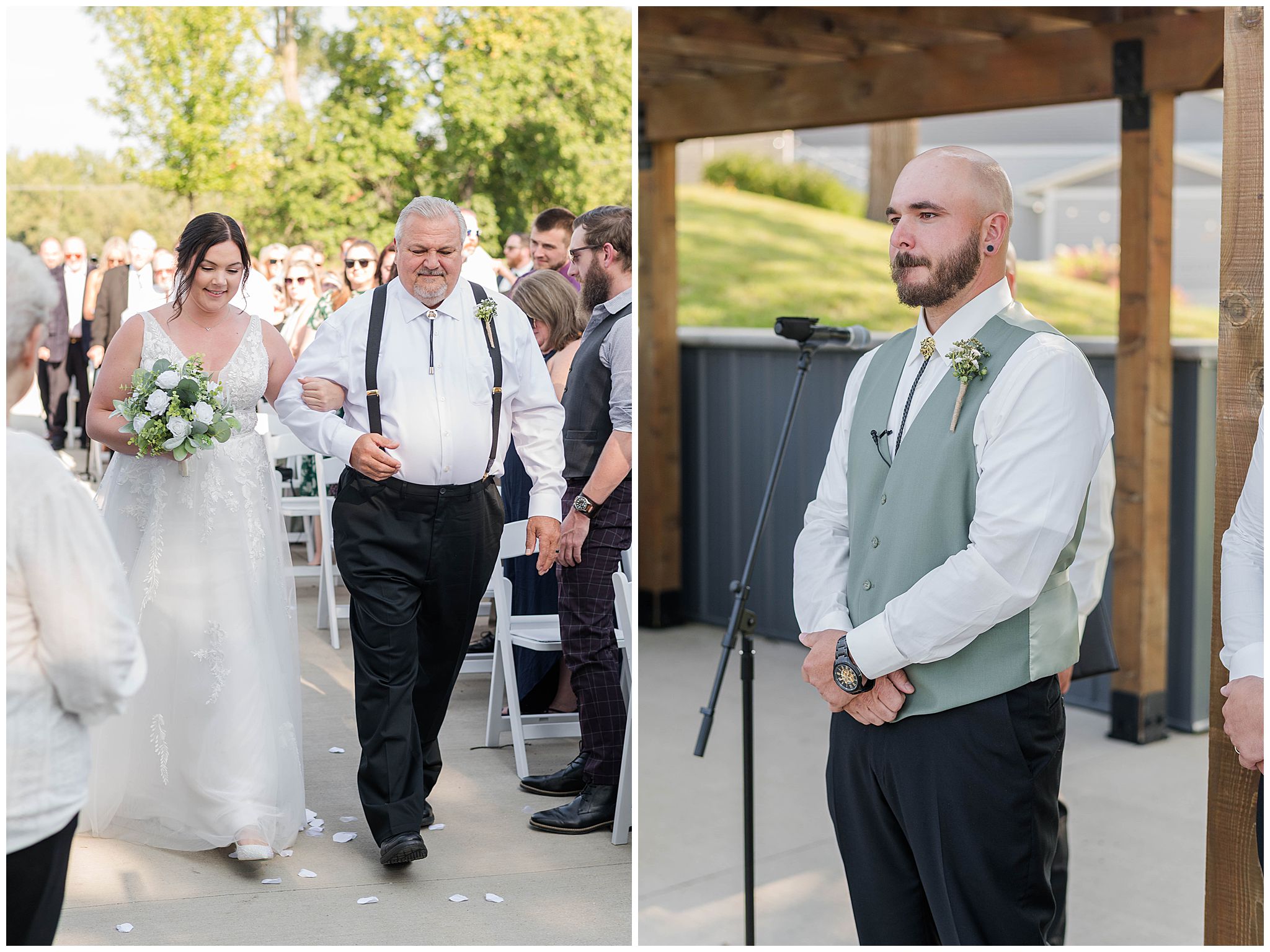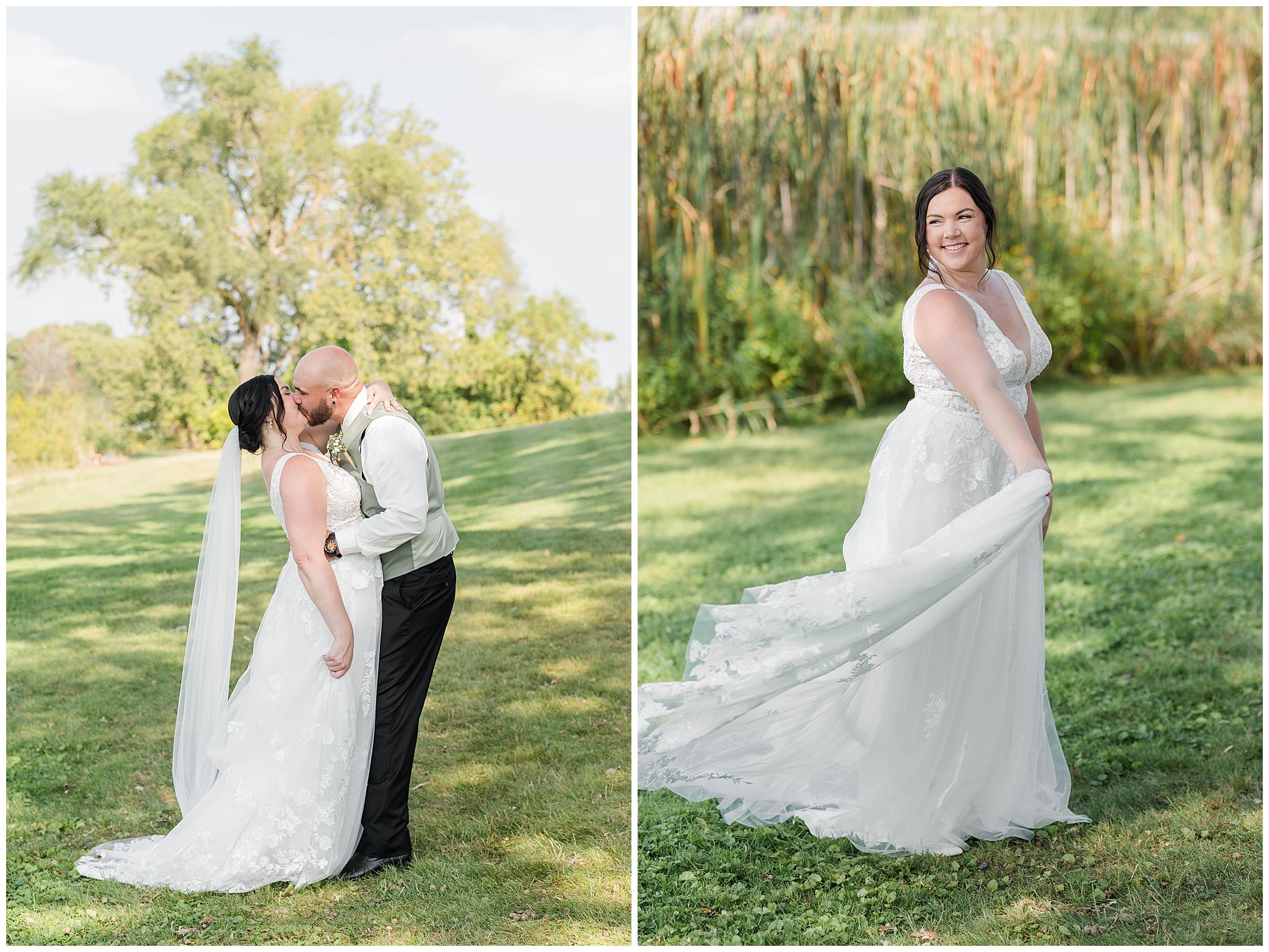 Liz and Devin’s ceremony took place at the beautiful outdoor ceremony space at Nippersink on the Lake, right by the water. With the bright September sunshine reflecting off the lake and their closest friends and family gathered around them, it created such a romantic setting.
